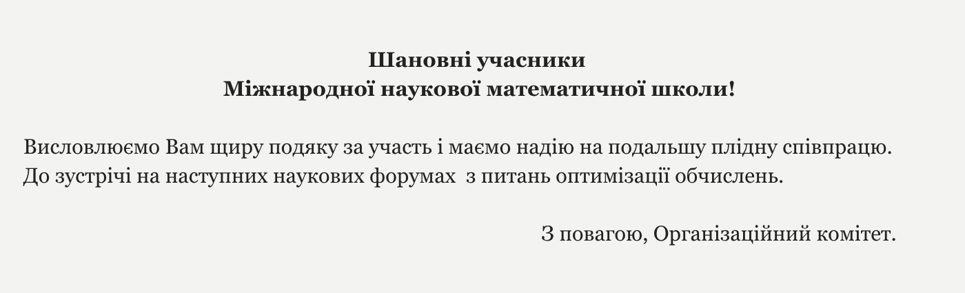30 вересня 2025 року на електронну пошту учасників було відправлено сертифікат про участь у Міжнародній науковій математичній школі “Питання оптимізації обчислень (ПОО-XLІX)”.